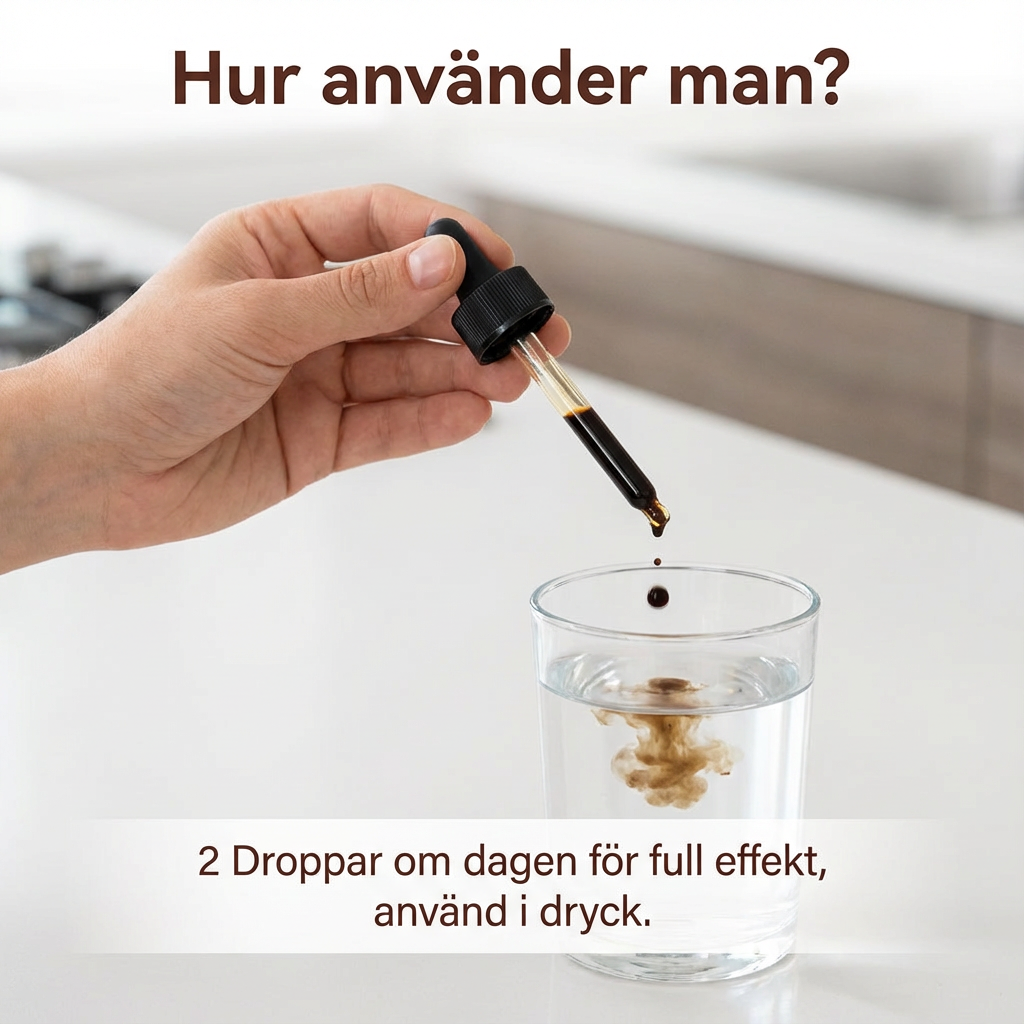 Ta två pipetter dagligen enligt anvisningarna på förpackningen. Produkten är enkel att använda och kan tas med eller utan mat.
